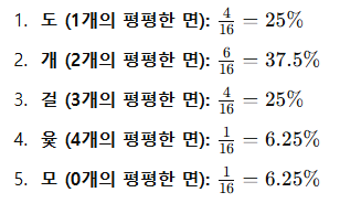 윷 던지기의 결과는 평평한 면과 둥근 면의 조합에 따라 결정됩니다. 4개의 윷으로 만들 수 있는 경우의 수는 16가지입니다.